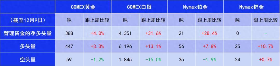 至12月初为止,各金属的基金多头飞腾,当中钯金合约履历了164周(自2022年10月23日起)基金净空后,终于收复净多头。